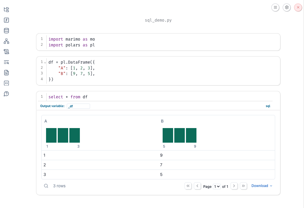 marimo has built-in support for SQL: you can query Python dataframes, databases, CSVs, Google Sheets, or anything else. After executing your query, marimo returns the result to you as a dataframe, making it seamless to go back and forth between SQL and Python.